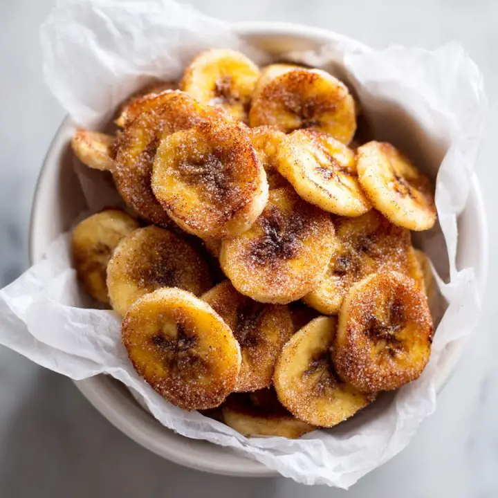Air Fryer Cinnamon Banana Chips are thinly sliced bananas coated with cinnamon sugar and cooked in an air fryer until crispy. They make a delicious snack or dessert!